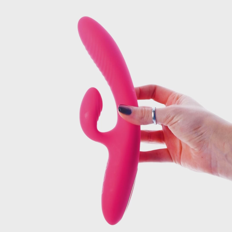 Premi il pulsante centrale per accendere e cambiare vibrazione, quello sotto per aumentare l’intensità e il termometro per il calore. Inserisci la parte lunga in vagina e lascia che quella corta stimoli il clitoride. Si consiglia di usarlo con un lubrificante a base d'acqua. Lavalo prima e dopo l'uso con un toy cleaner.